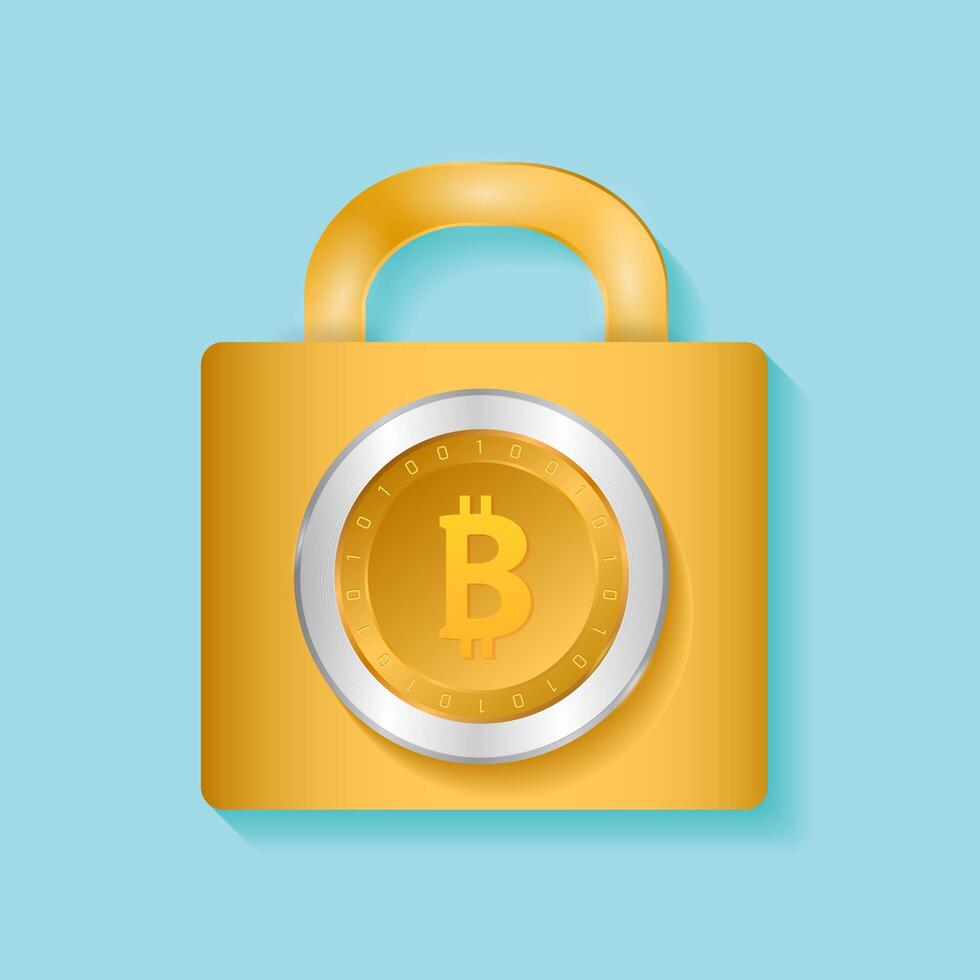 Locked bitcoin coin. Bitcoin security vector design concept. cryptocurrency vector illustration. Bitcoin security, safety, saving, protection concept. Bit coin cryptocurrency, blockchain. Pro Vector