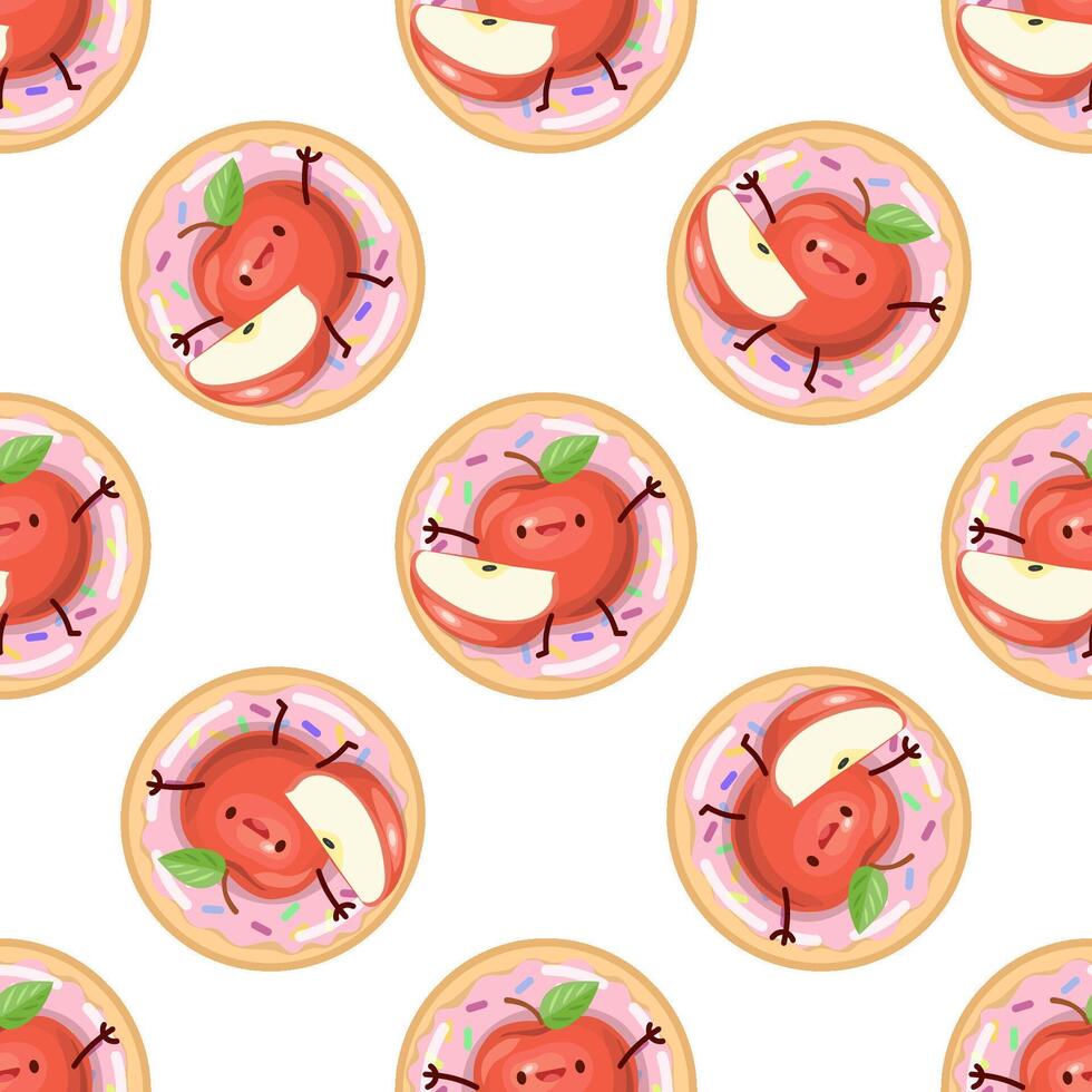 Seamless pattern with cute apple characters on donuts in flat style on white background Pro Vector