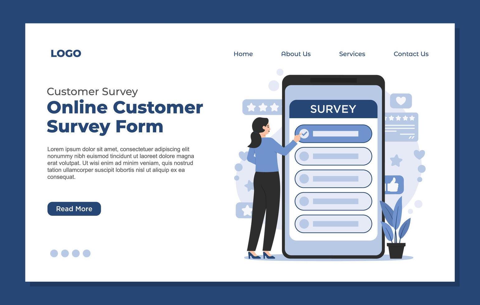 Landing page template for customer survey and online survey concept with data analysis illustration. Pro Vector