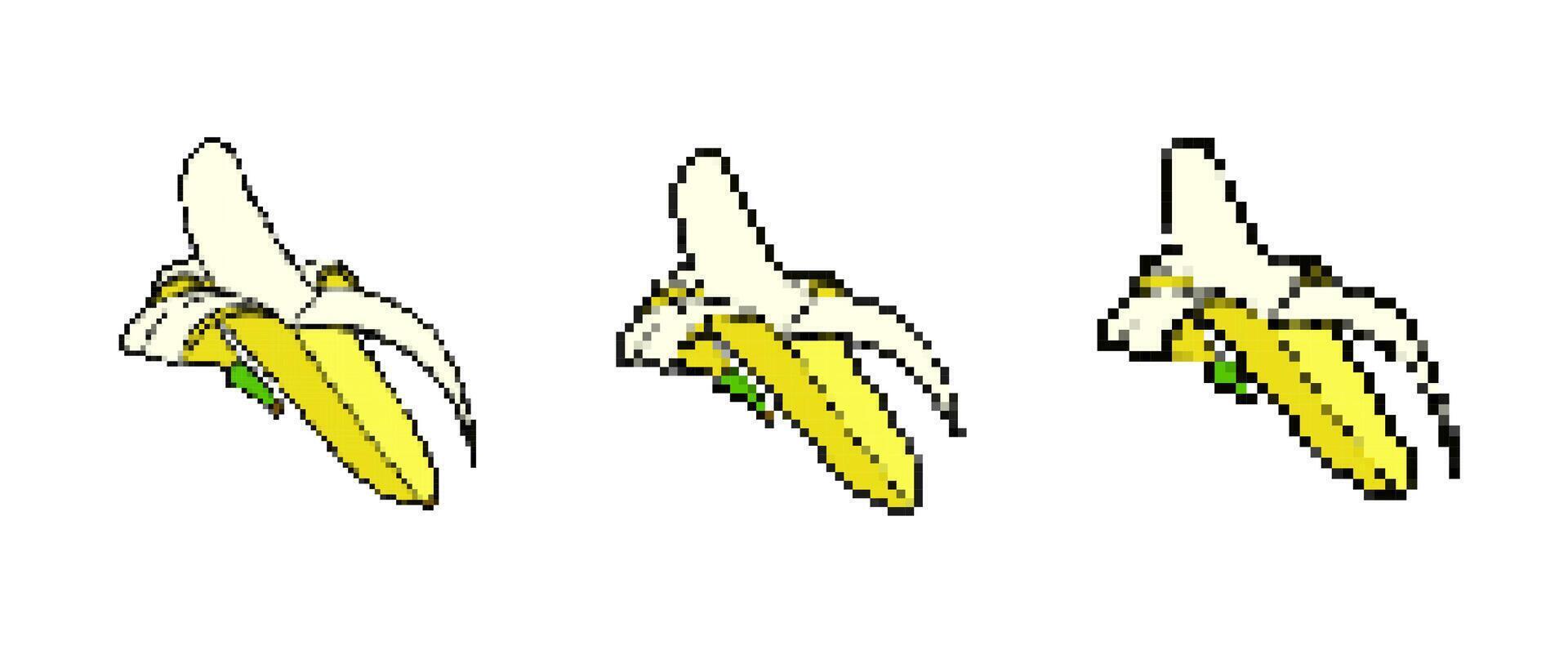 Three pixel art style bananas with peeling effect displayed in a simple artistic arrangement Pro Vector