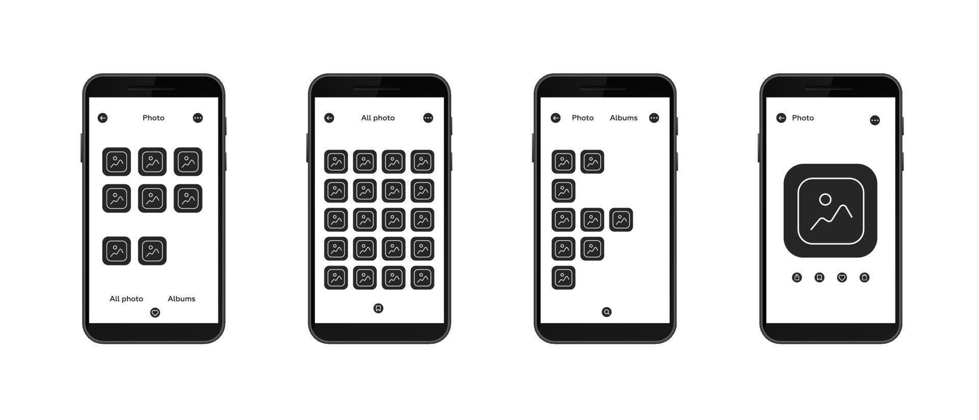 Four smartphones displaying different grid layouts of image icons on screens Pro Vector