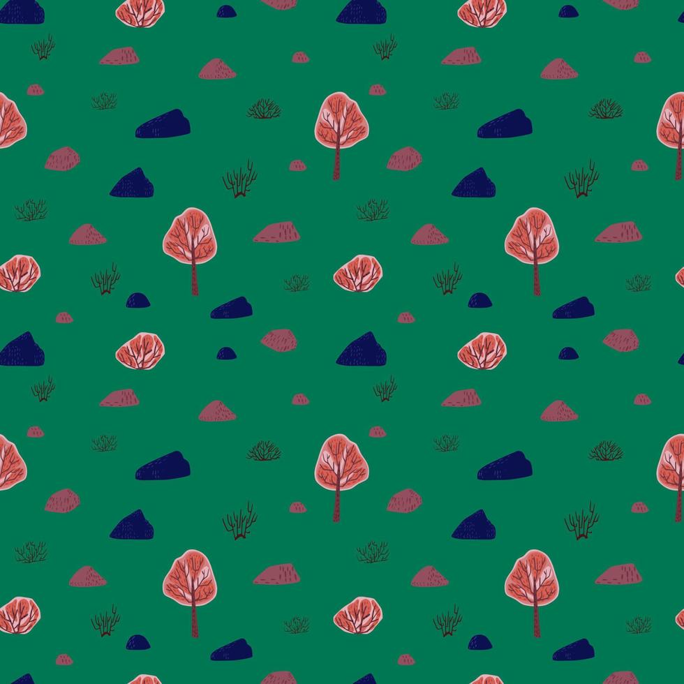 Seamless pattern trees and stones on green background. Abstract texture decoration from tree, rock and bushes. Pro Vector