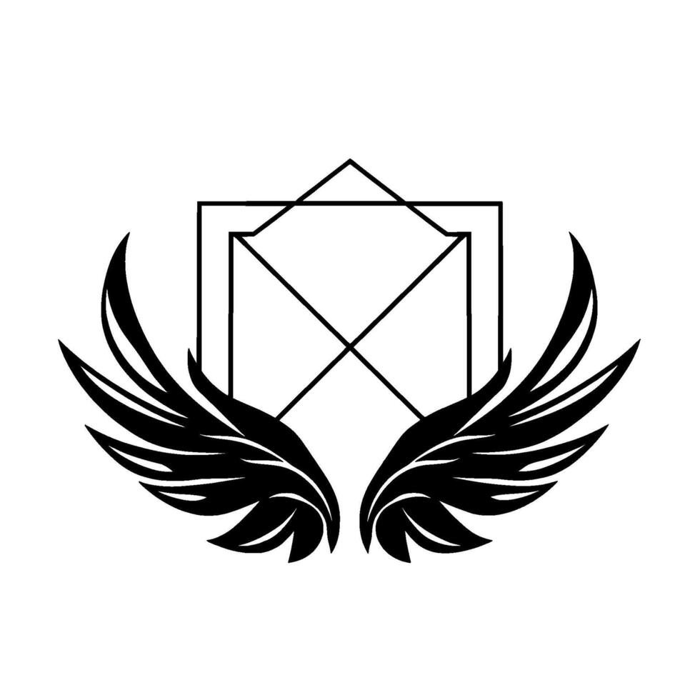 Black and White Geometric Featuring Winged Symbol with Angular Frame and Cross Elements. Pro Vector