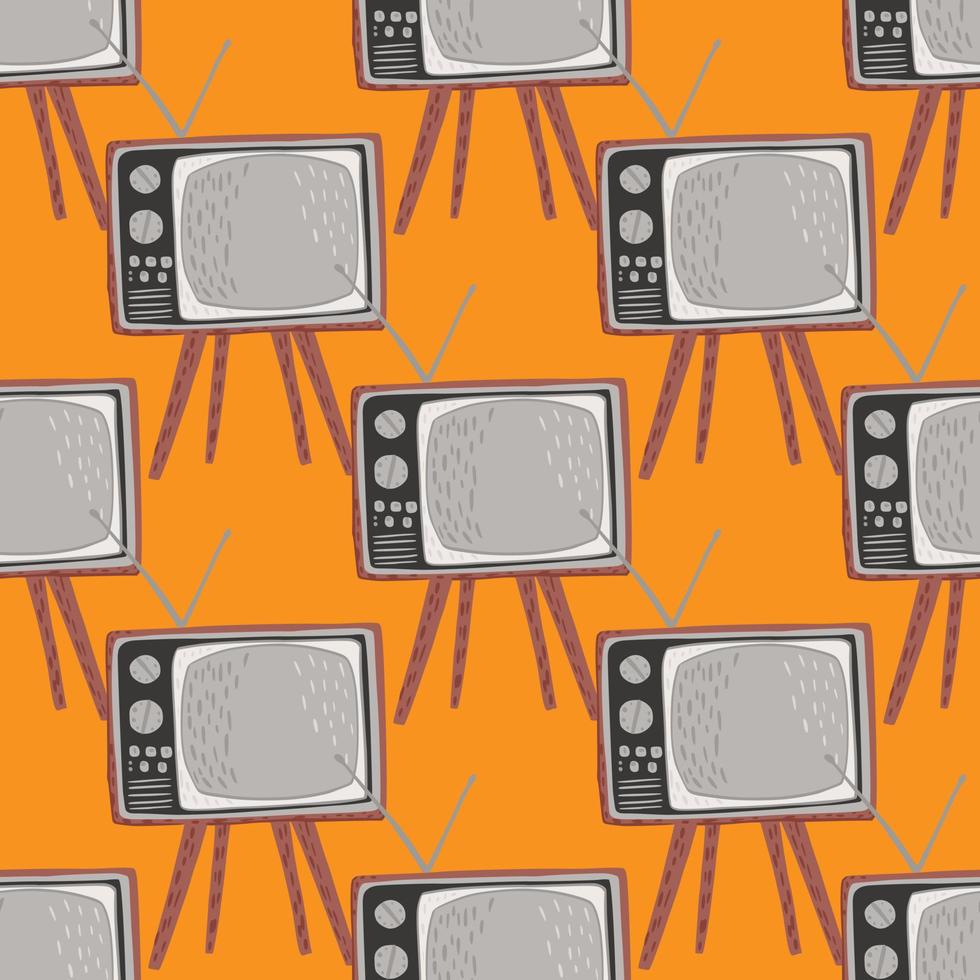 Retro seamless pattern with tv simple ornament. Grey technic on bright orange background. Pro Vector
