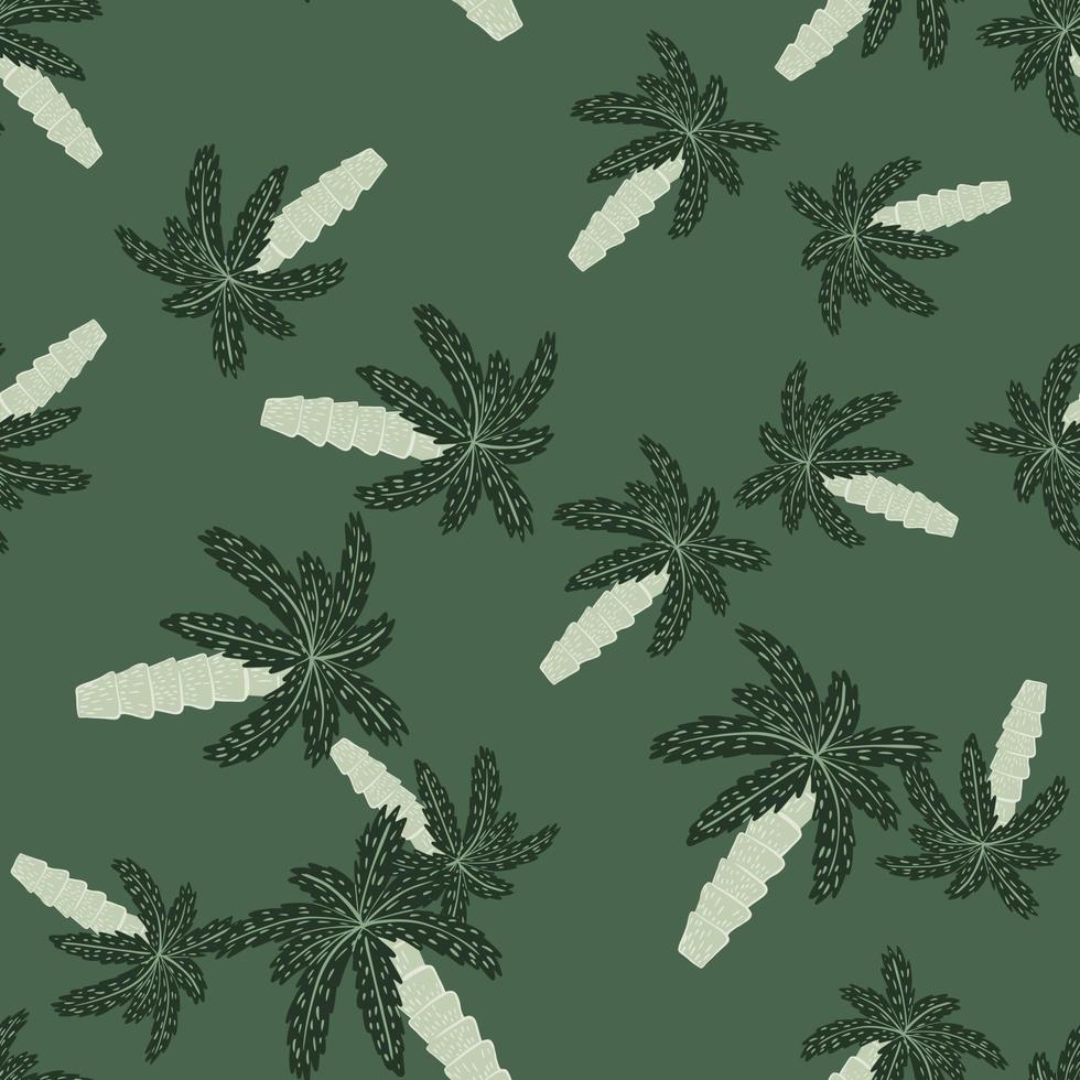 Botanic seamless random pattern with hand drawn palm tree ornament. Green background. Simple design. Pro Vector