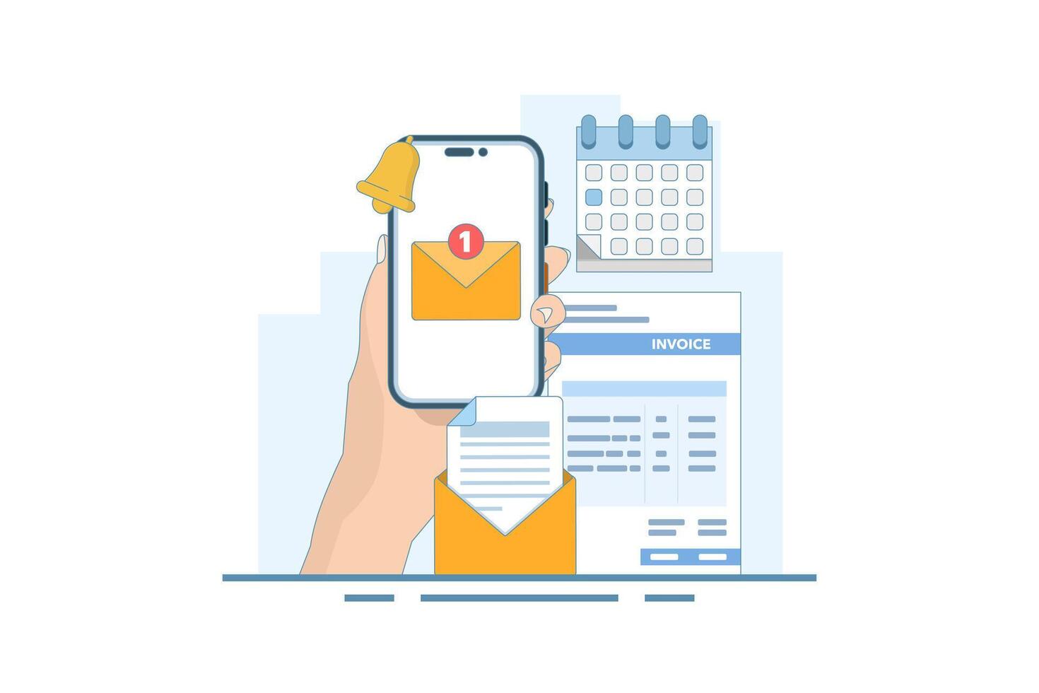 Payment reminder message notification concept. Payment reminder alarm message notification on smart phone screen with invoice email letter. Flat cartoon design illustration on background. Pro Vector