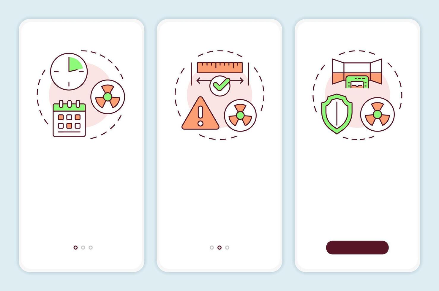 Principles of radiation exposure onboarding mobile app screen. Walkthrough 3 steps editable graphic instructions with linear concepts. UI, UX, GUI template Pro Vector