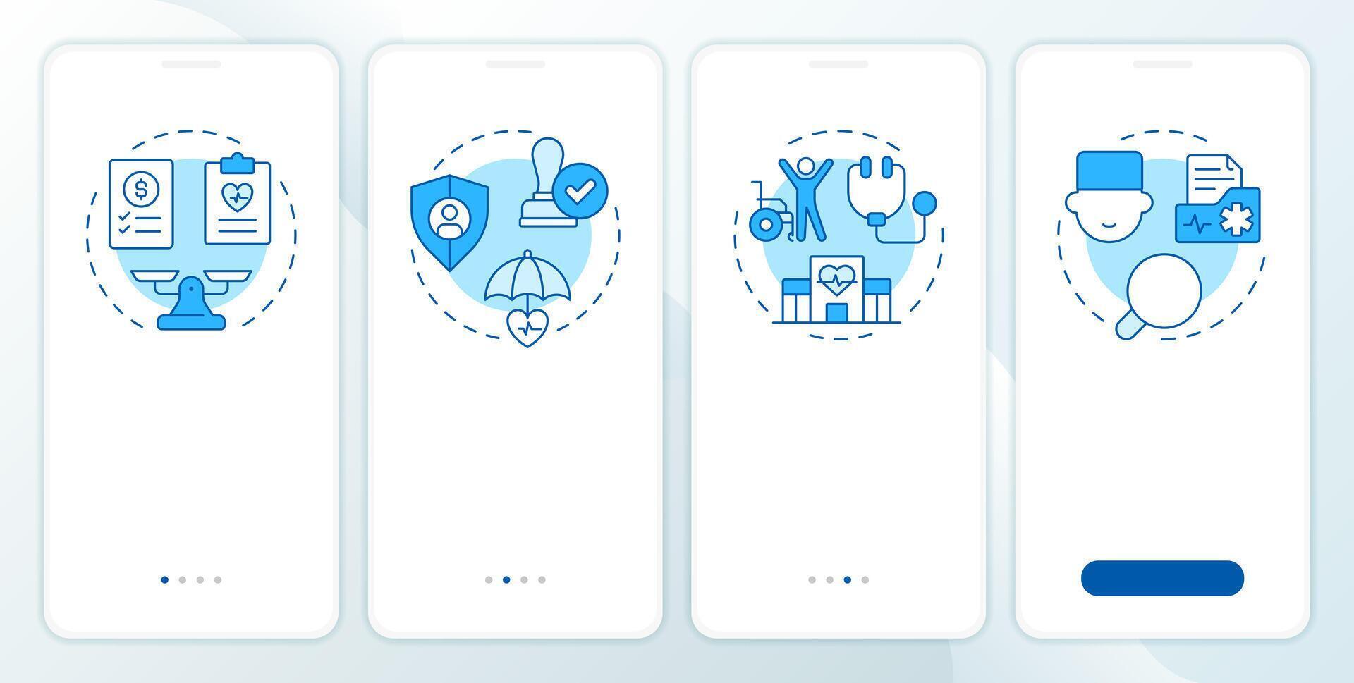 Cons of utilization management blue onboarding mobile app screen. Walkthrough 4 steps editable graphic instructions with linear concepts. UI, UX, GUI template Pro Vector