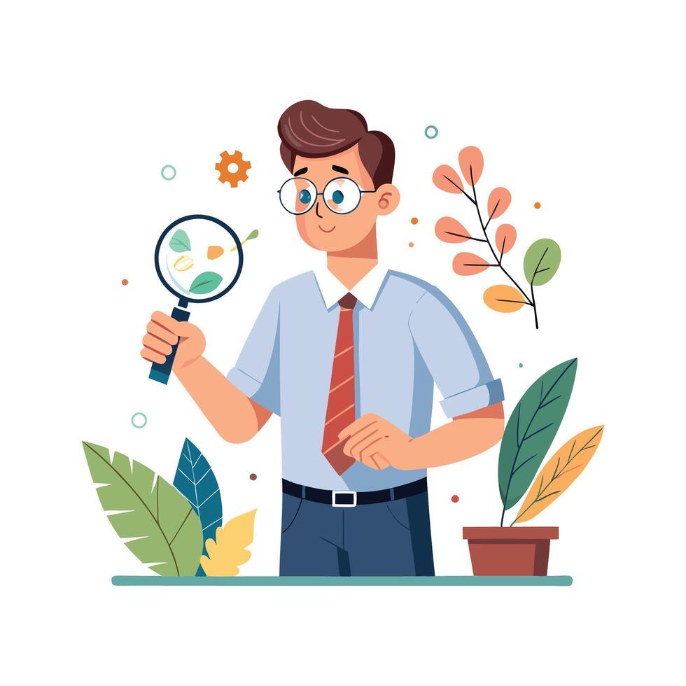 Dynamic Educator Using Magnifying Glass for Teaching. Pro Vector