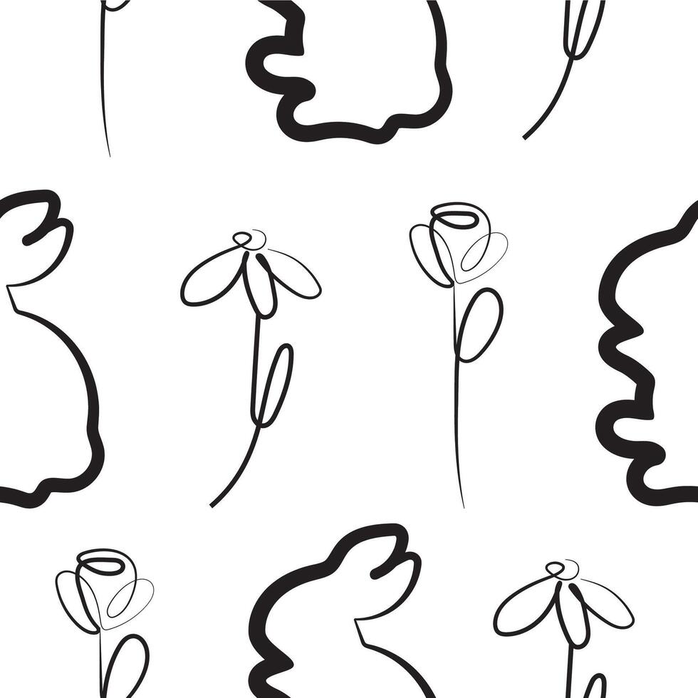 seamless pattern with simple icons of rabbits that washes with buds of various flowers in line art style, for logos or holiday designs Pro Vector