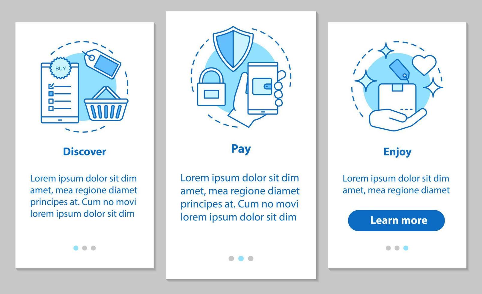 Online shopping onboarding mobile app page screen with linear concepts. Digital purchase. Discover deal, pay, enjoy steps graphic instructions. UX, UI, GUI vector template with illustrations Pro Vector