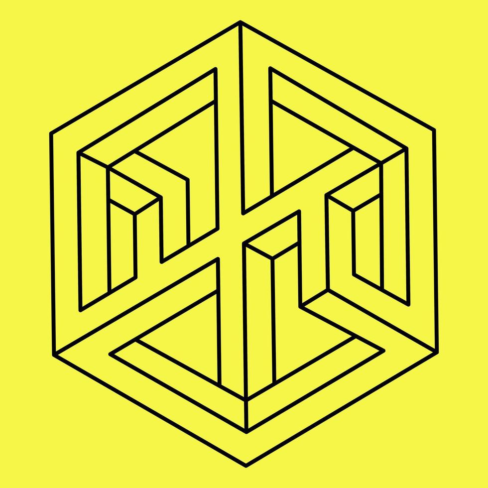 Impossible shapes. Sacred geometry. Optical illusion. line art. Abstract eternal geometric object. Impossible endless outline. Op art. Impossible geometry shape on a yellow background. Pro Vector