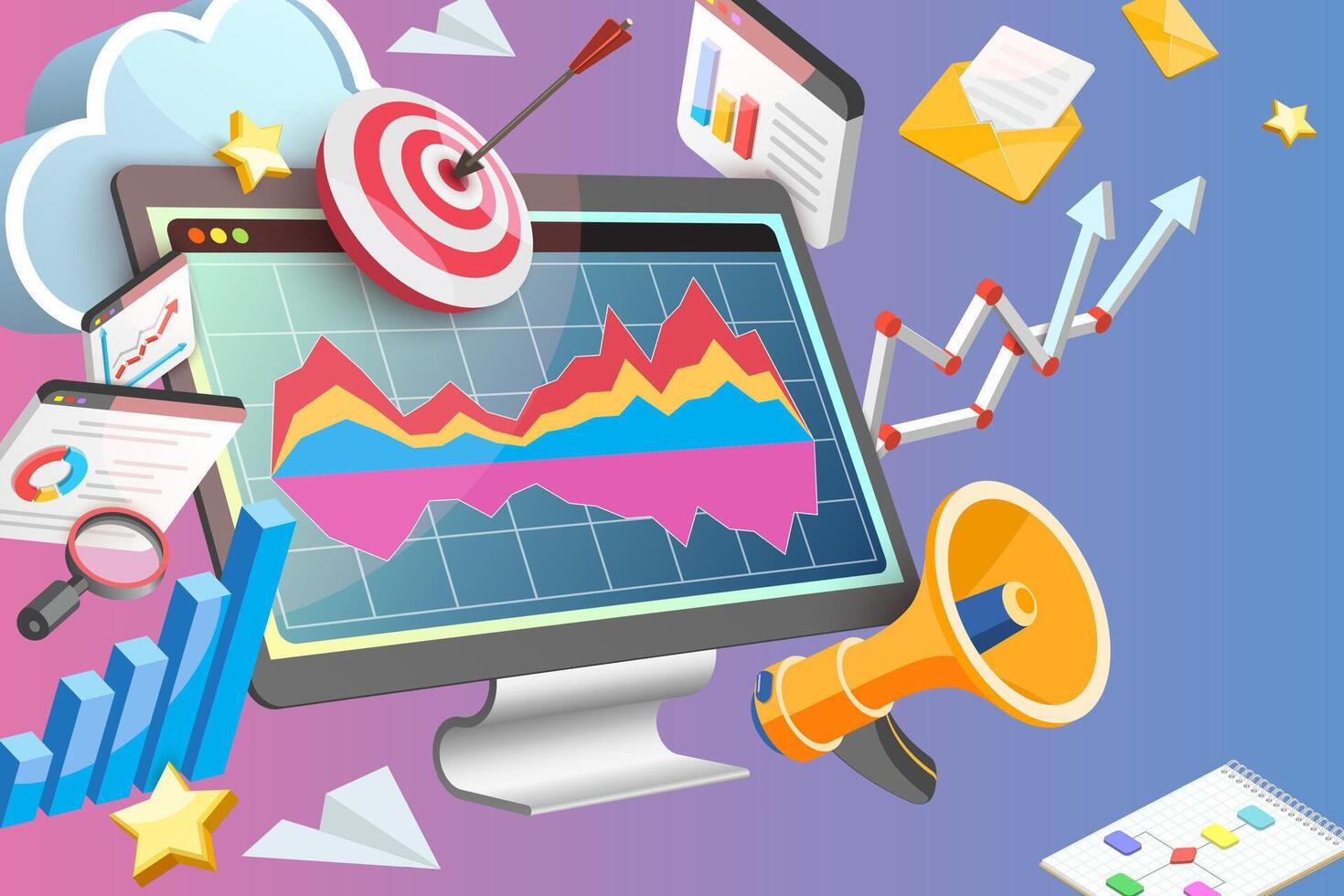 3D Conceptual Illustration of Data Driven Social Media Strategy, Marketing Data and Web Analysis Pro Vector