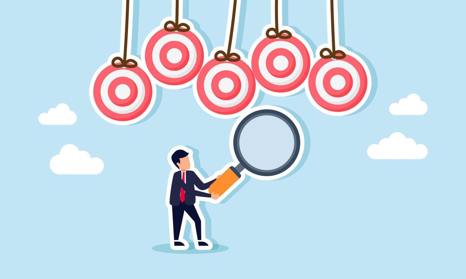 Businessman holds a magnifying glass to observe hanging target boards, illustration of business analysis and evaluation for risk mitigation and target planning Pro Vector