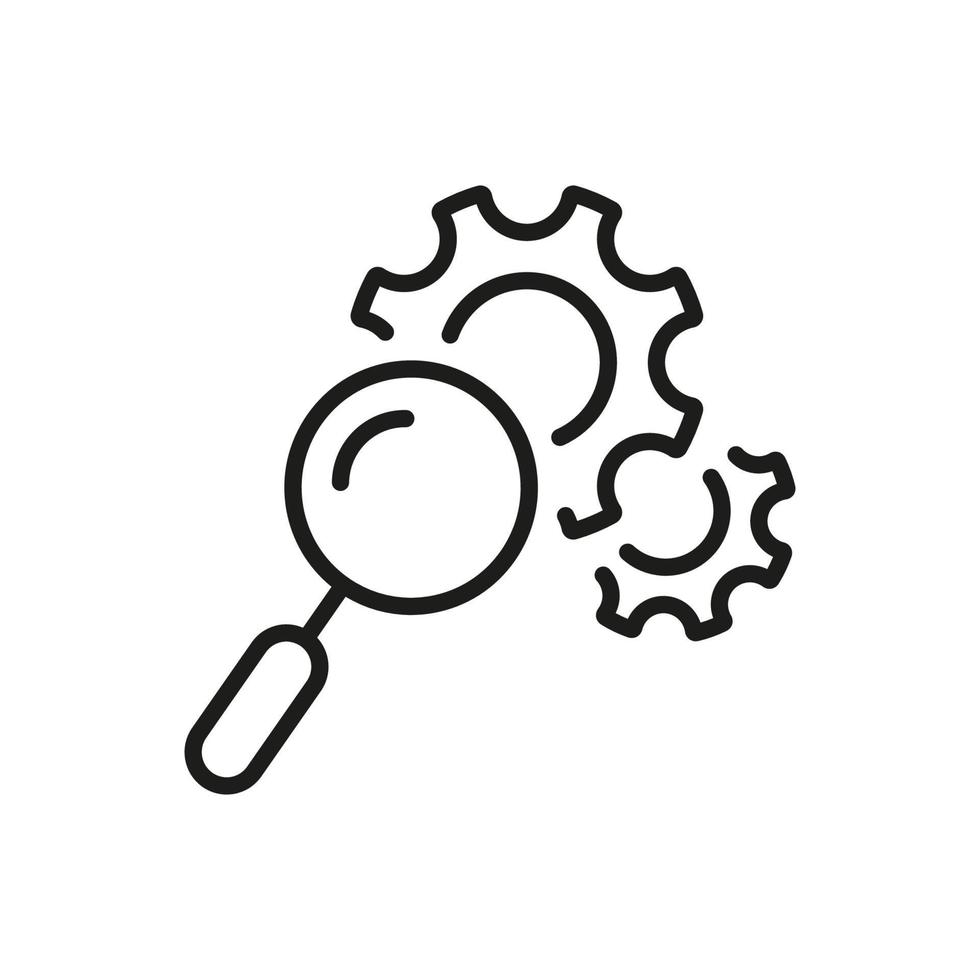 Loupe with Cogwheel Line Icon. Magnifying Glass with Gears. Service of Search and Control. Maintenance of Factory Mechanism. Isolated Vector Illustration. Pro Vector