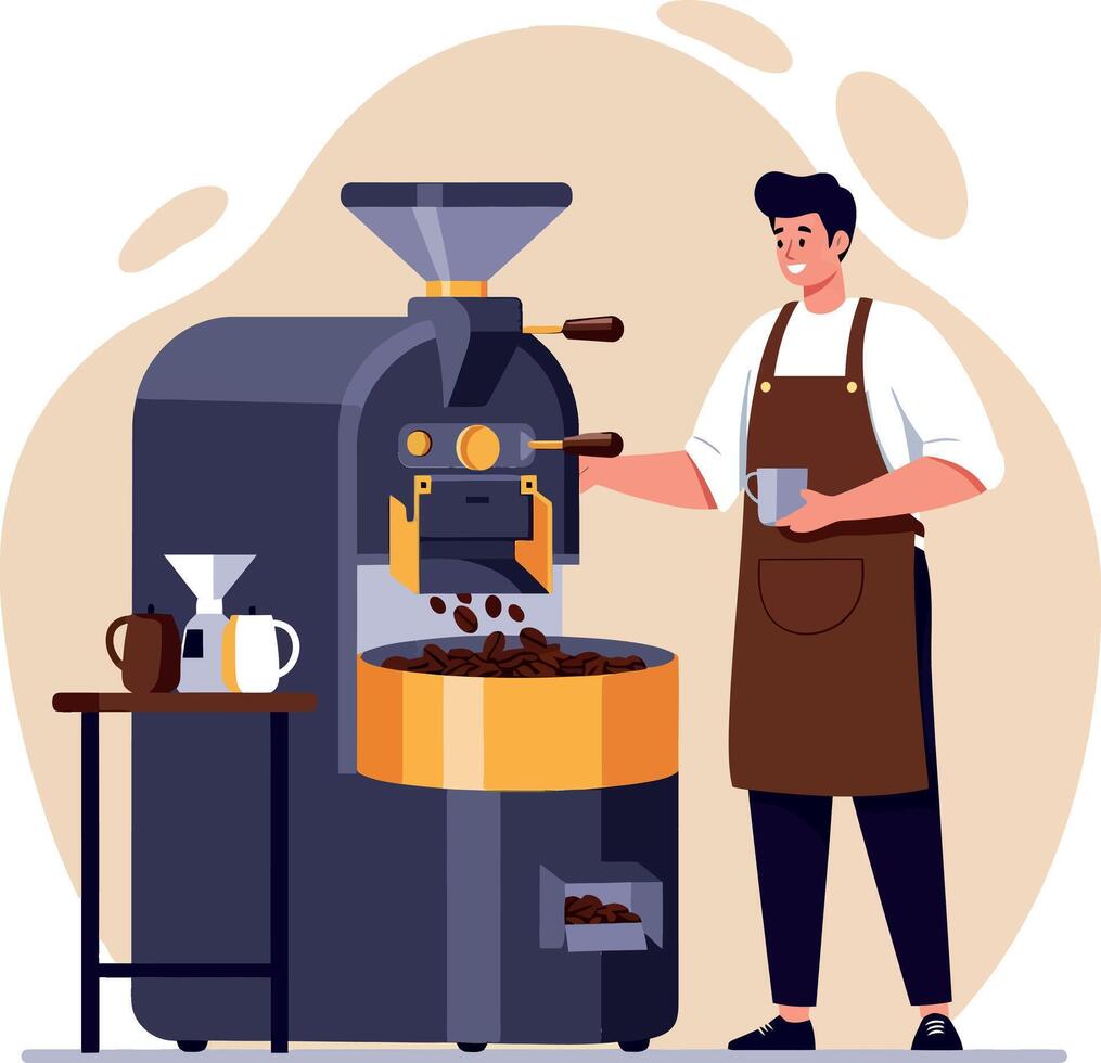 Coffee roaster operating a machine in a minimalistic design style, showcasing passion for coffee, art Pro Vector