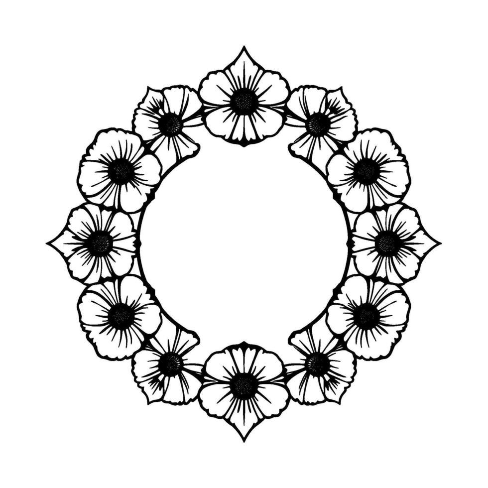 Ornate Black and White Floral Wreath Delicate HandDrawn Line Art with a Central Empty Circle for Customization or Text Placement. Pro Vector