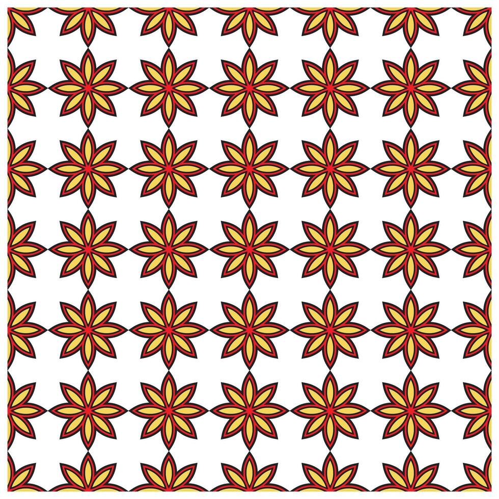 A repeating pattern of stylized flowers in red, orange, and black on a white background, creating a vibrant geometric design. Free Vector
