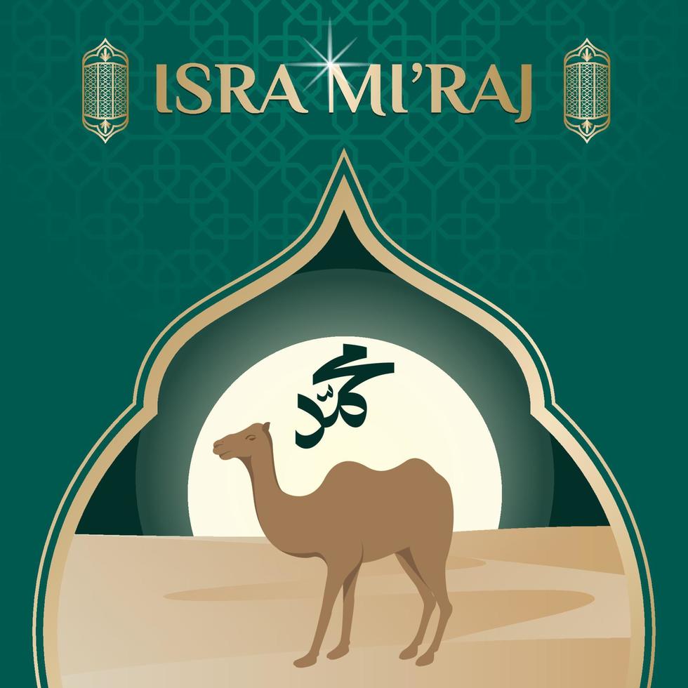 Al-Isra wal Mi'raj Night journey of the Prophet Muhammad. post feed square background. illustration of the journey of the desert camel and the mosque Pro Vector