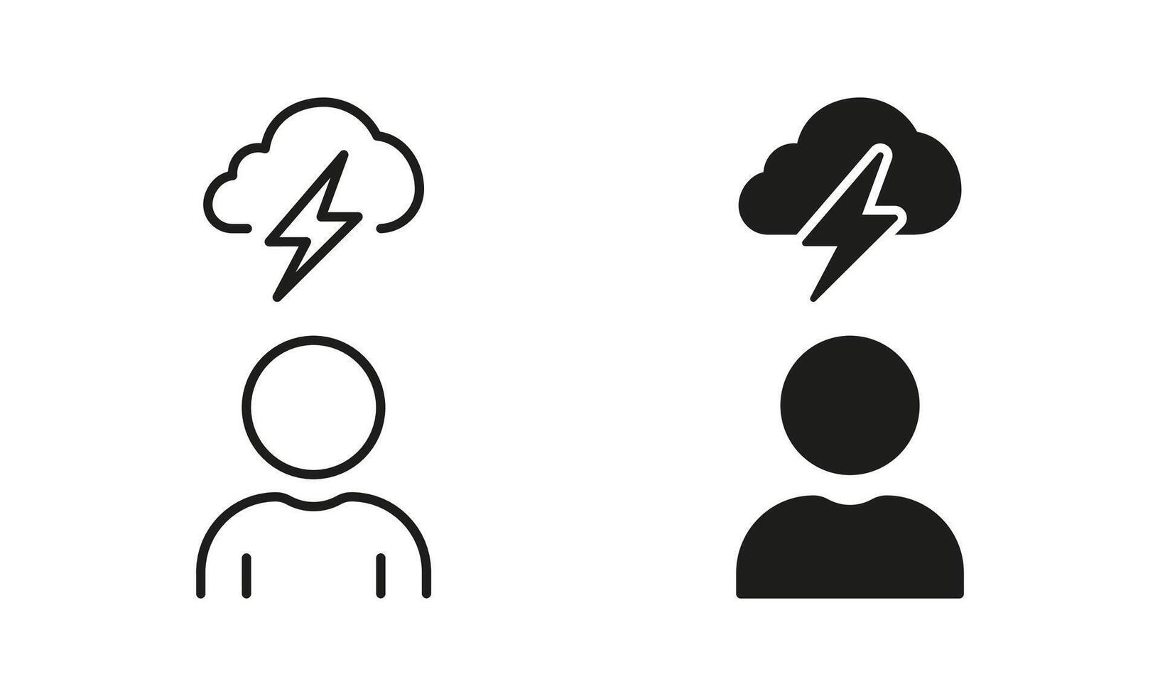 Thunder Storm with Cloud and Lightning. Creativity Think, Strategy Solution Symbol. Man Brainstorming Line and Silhouette Icon Set. Editable Stroke. Isolated Illustration Pro Vector