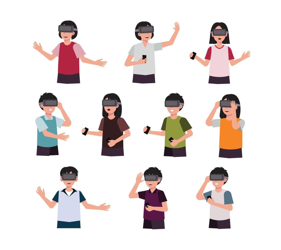 A modern collection of illustrations people using virtual reality gadgets. For tech projects, gaming concepts, futuristic designs, and digital innovation themes Pro Vector