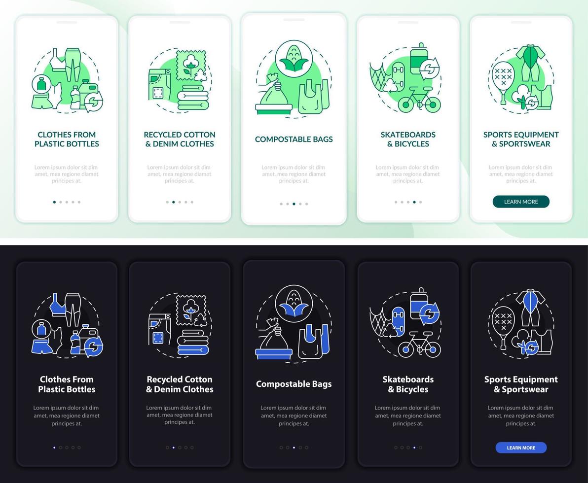Upcycling trend onboarding mobile app page screen. Garbage recycling walkthrough 5 steps graphic instructions with concepts. UI, UX, GUI vector template with linear night and day mode illustrations Pro Vector