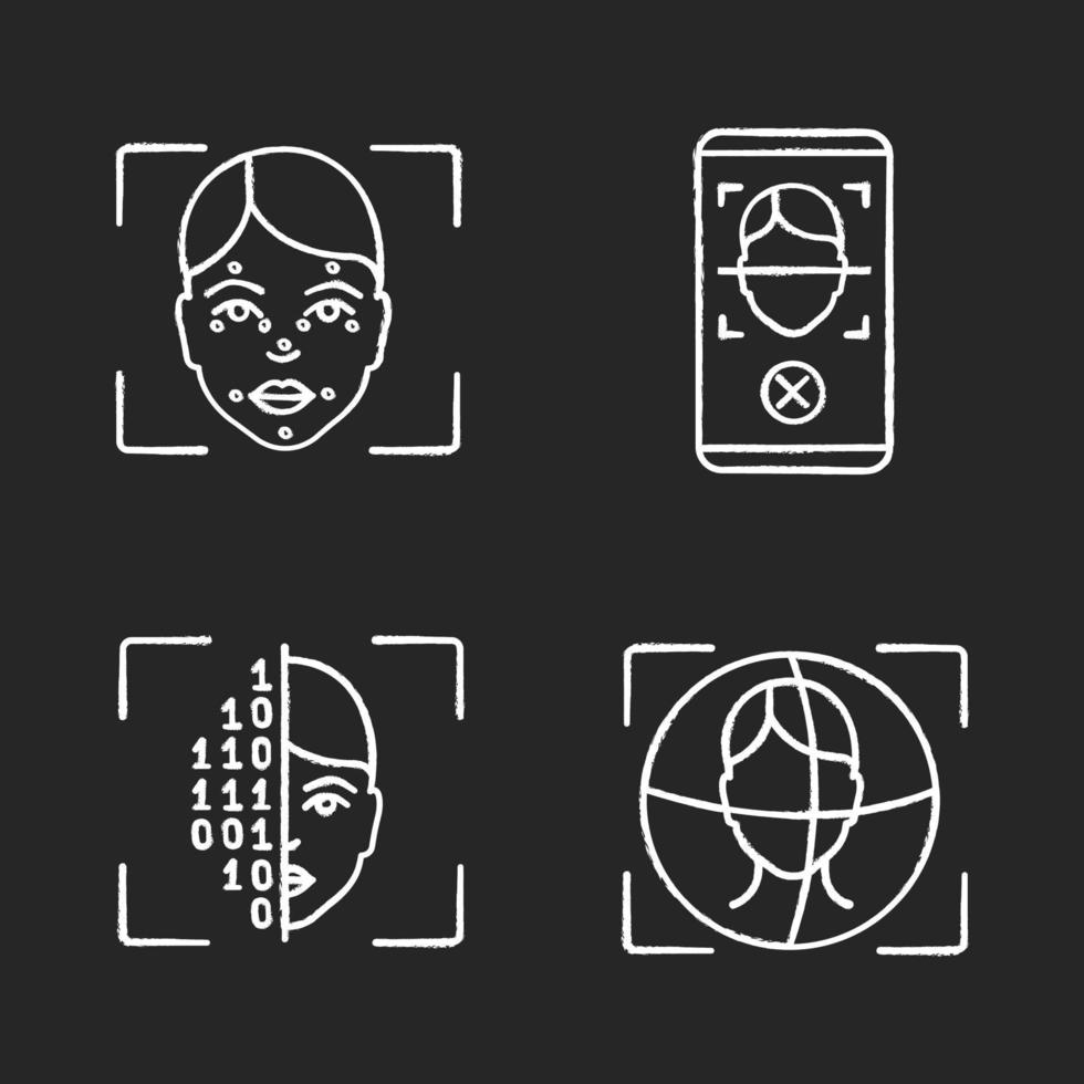 Facial recognition chalk icons set. Biometric identification. Faceprint analysis, face scan smartphone app rejection, binary code, 3d ID scnner. Isolated vector chalkboard illustrations Pro Vector