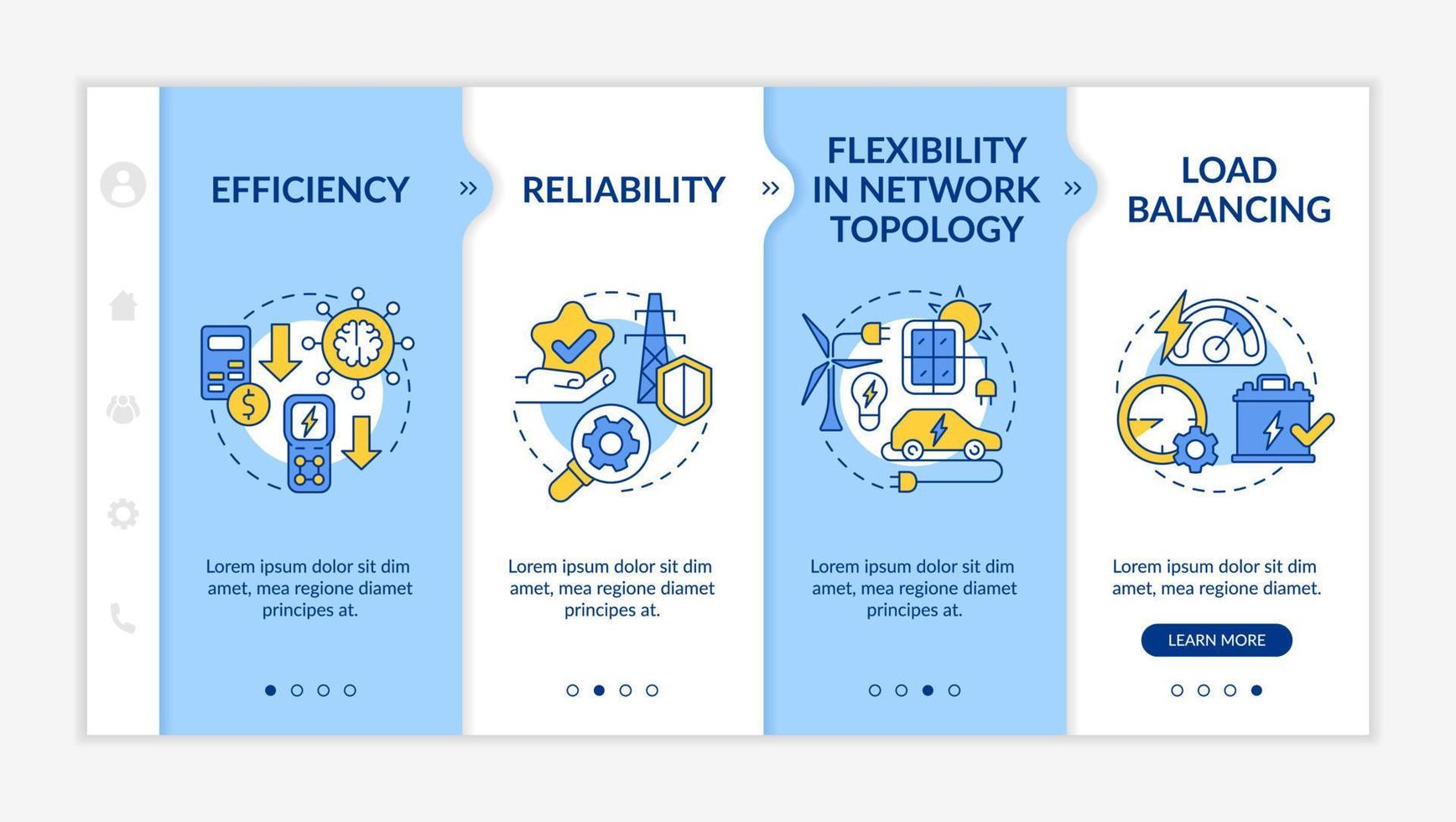 Smart grid features blue and white onboarding template. System integration. Responsive mobile website with linear concept icons. Web page walkthrough 4 step screens. Lato-Bold, Regular fonts used Pro Vector