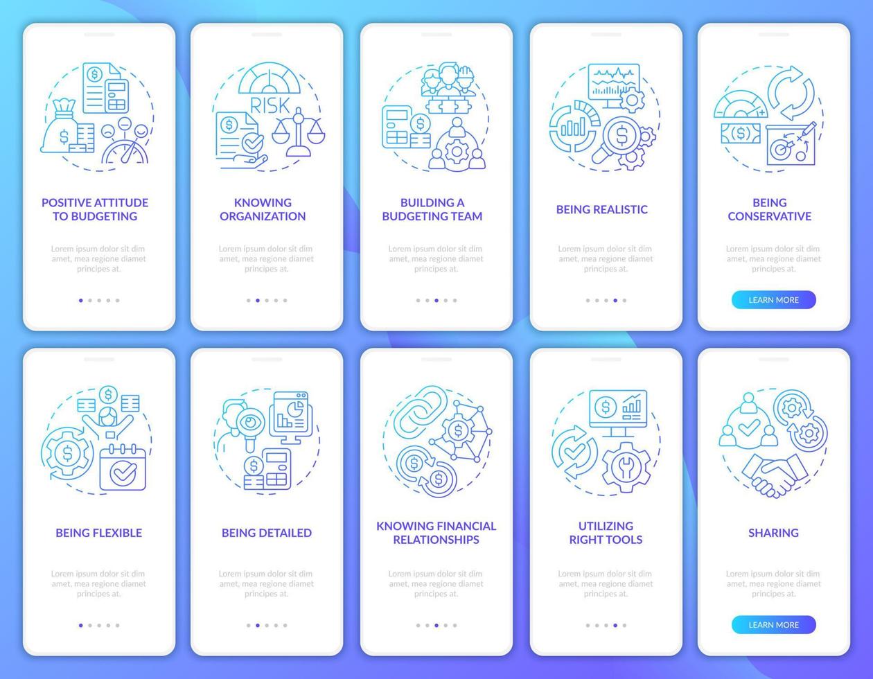 Financial business plan blue gradient onboarding mobile app screen set. Walkthrough 5 steps graphic instructions pages with linear concepts. UI, UX, GUI template. Myriad Pro-Bold, Regular fonts used Pro Vector