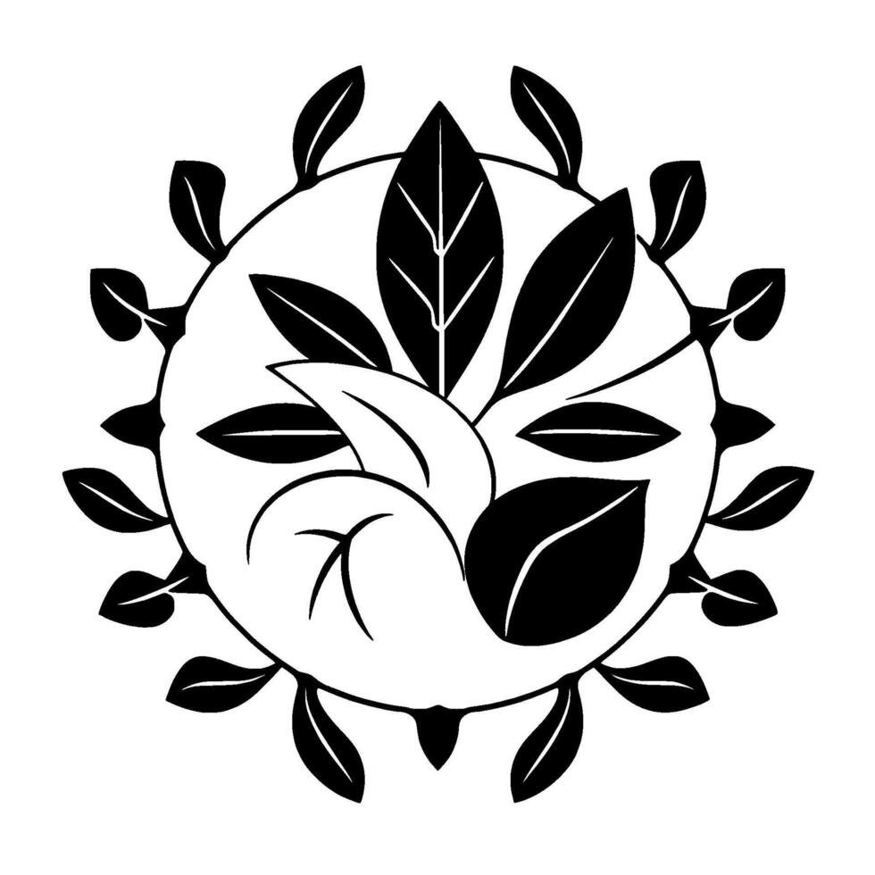 A stylized, symmetrical featuring a central cluster of bold, black leaves enclosed within a ring of smaller, leaflike shapes on a bright white background, creating a minimalist, natural motif. vector