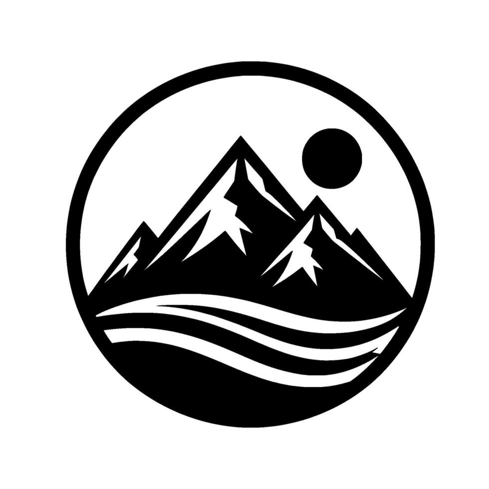 Monochromatic circular featuring stylized mountain peaks with snowy crests, a setting sun, and layered wave patterns. Pro Vector