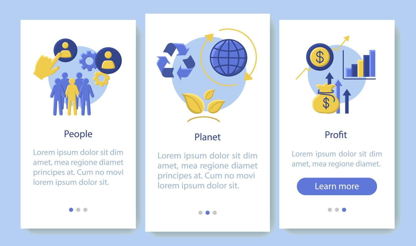 Resource management onboarding mobile app page screen vector template. People, planet and profit. Triple bottom line. Flat design website instructions. UX, UI, GUI smartphone interface cartoon concept Pro Vector
