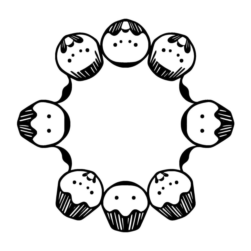 illustration of a circular arrangement of black and white cupcakes, creating a symmetrical pattern, and leaving an empty space in the middle. vector
