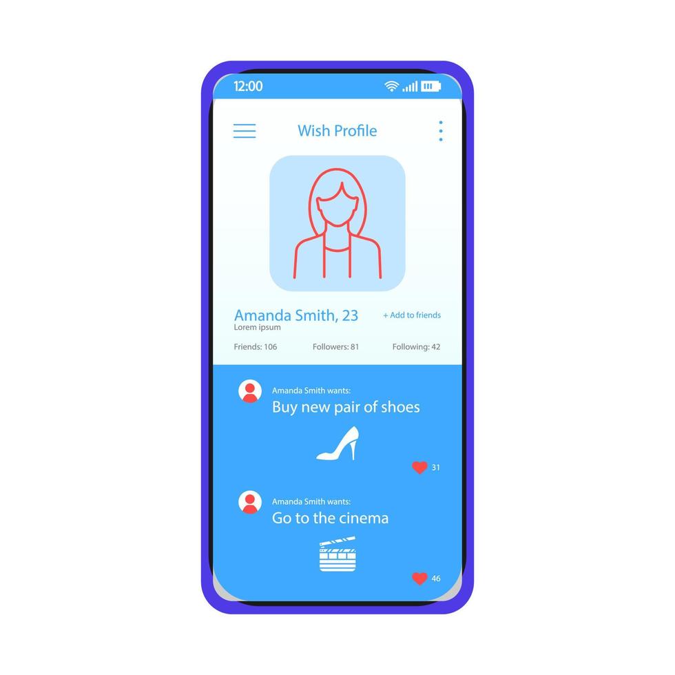 Wishlist app smartphone interface vector template. Female profile with desires screen. Mobile wish application page blue design layout. Flat UI. Shopping and plans online listing on phone display Pro Vector and Pro SVG