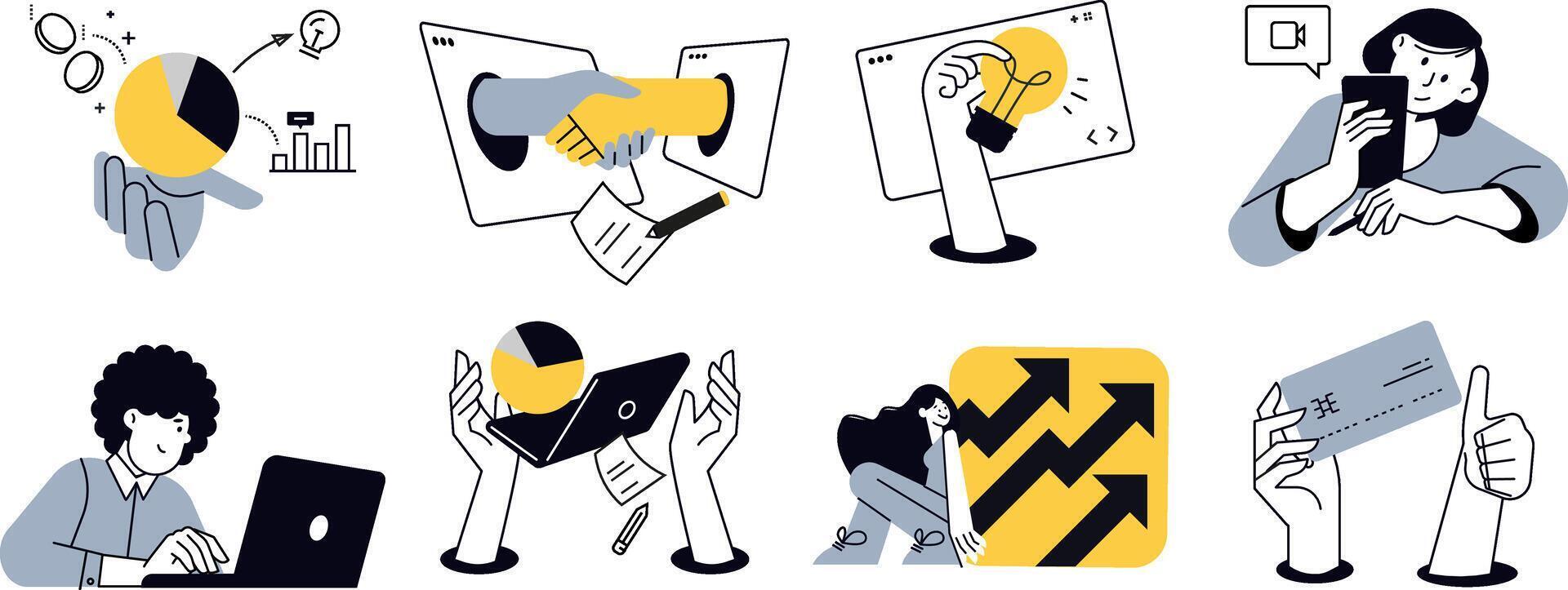 Business and technology illustrations of web design and development, startup and online business, seo, app development, e-commerce, strategy and planning, communication. Pro Vector