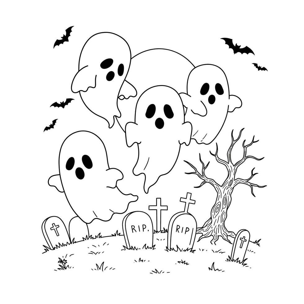 Outline of Cheerful Floating Ghosts in a Graveyard With Simple Headstones, a Spooky Tree and Bats in the Background Pro Vector
