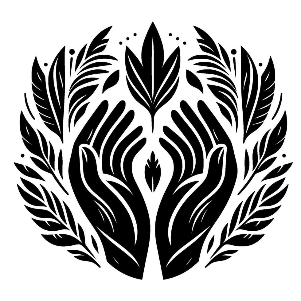 Black White Artistic Rendering of Open Hands Enclosing a Central Bud, Surrounded by Leafy Branches, Symbolizing Growth and Protection. vector