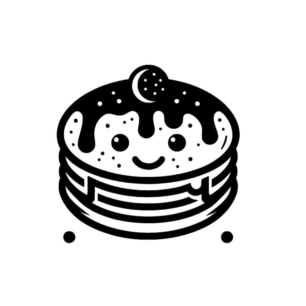 Whimsical Black and White Pancake Character with Smiling Face, Drizzled with Syrup and Topped with a MoonShaped Cookie on White Background. Pro Vector