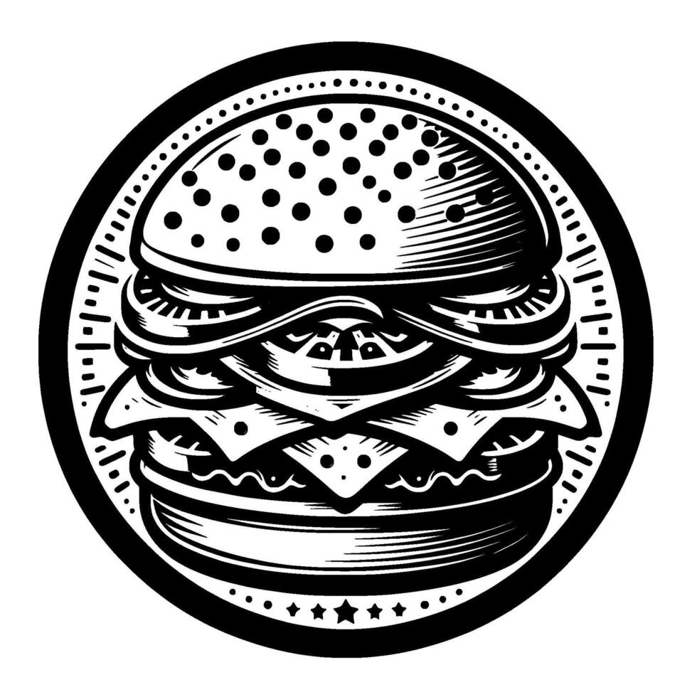Detailed monochrome illustration of a stacked burger with multiple fillings, within a circular frame, emphasizing texture. Pro Vector