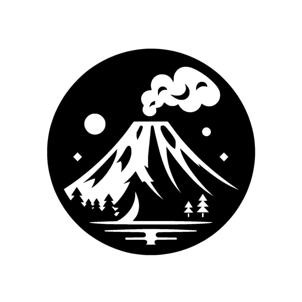 Stylized, minimalist illustration of a snowcapped volcano erupting smoke, with a surrounding forest and lake, encapsulated in a dark circular frame with celestial elements. vector