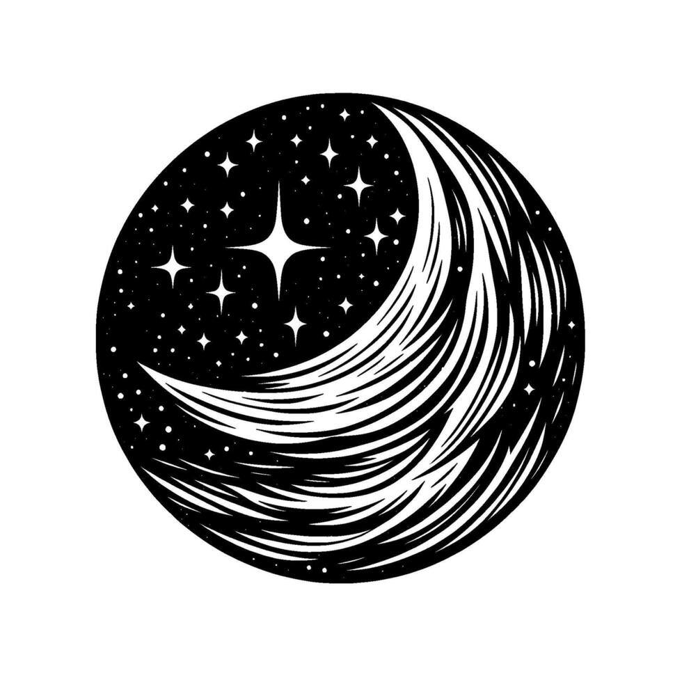 Celestial Monochrome Crescent moon with flowing lines, embedded in a starry night sky, all set within a circular frame, in highcontrast art. Pro Vector