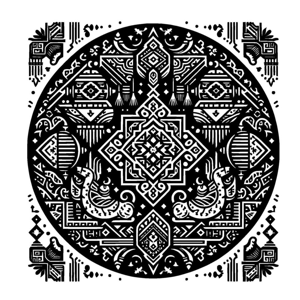 Ornate black and white symmetrical featuring geometric patterns, birds, lanterns, and intricate details within a circular frame. vector