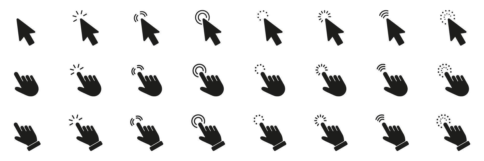 Cursor And Hand Click Solid Icon Set. Click And Cursor Action Silhouette Symbol Collection. Isolated Illustration Pro Vector