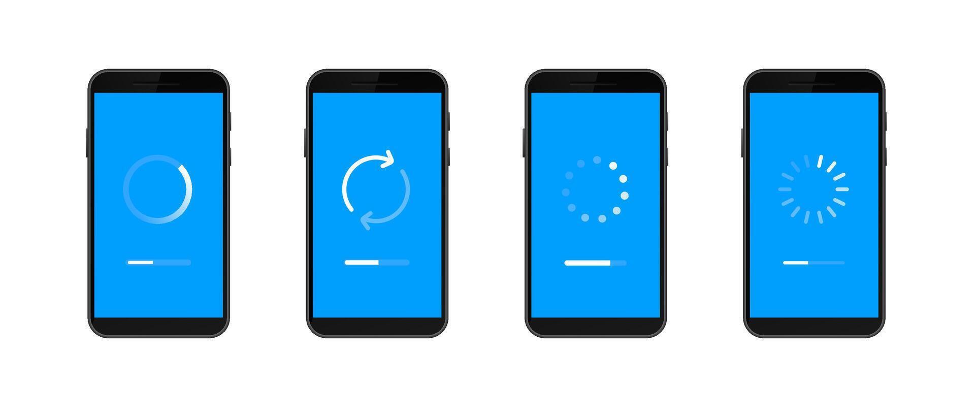 Four smartphones show different loading screens with blue background and progress indicators Pro Vector