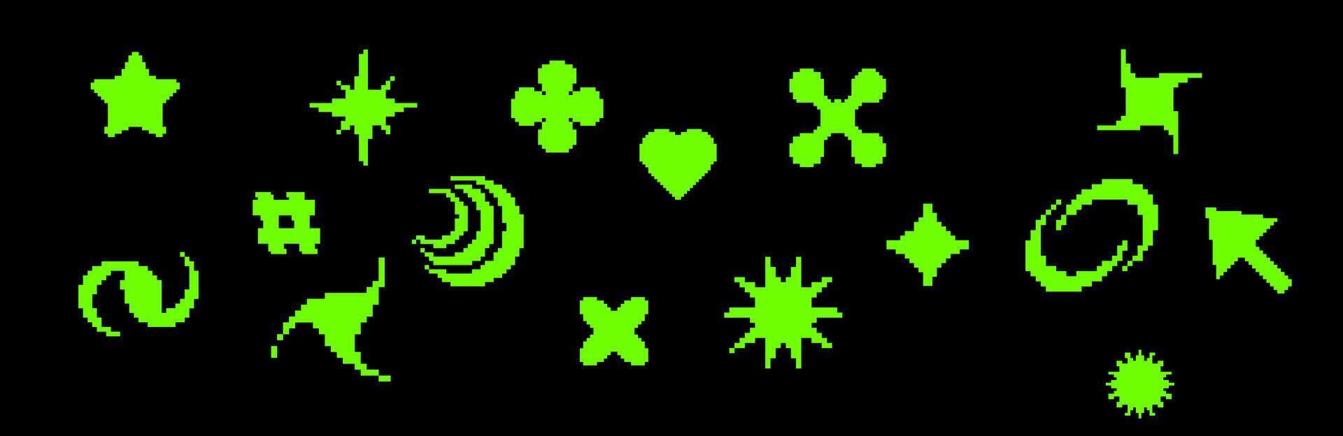 Retro pixel elements with hearts, arrows, and computer graphics. Pro Vector
