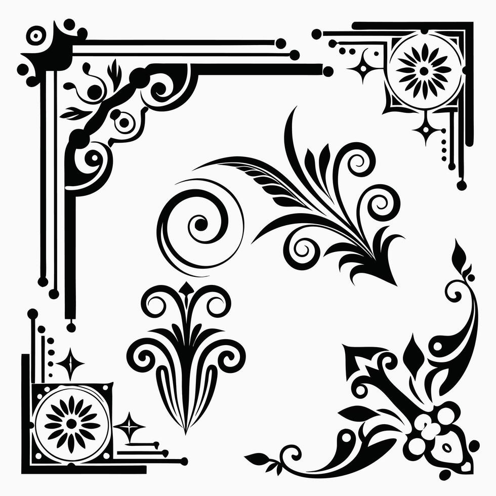 a set of decorative elements, including a square, a star, a flower, and a scroll Pro Vector