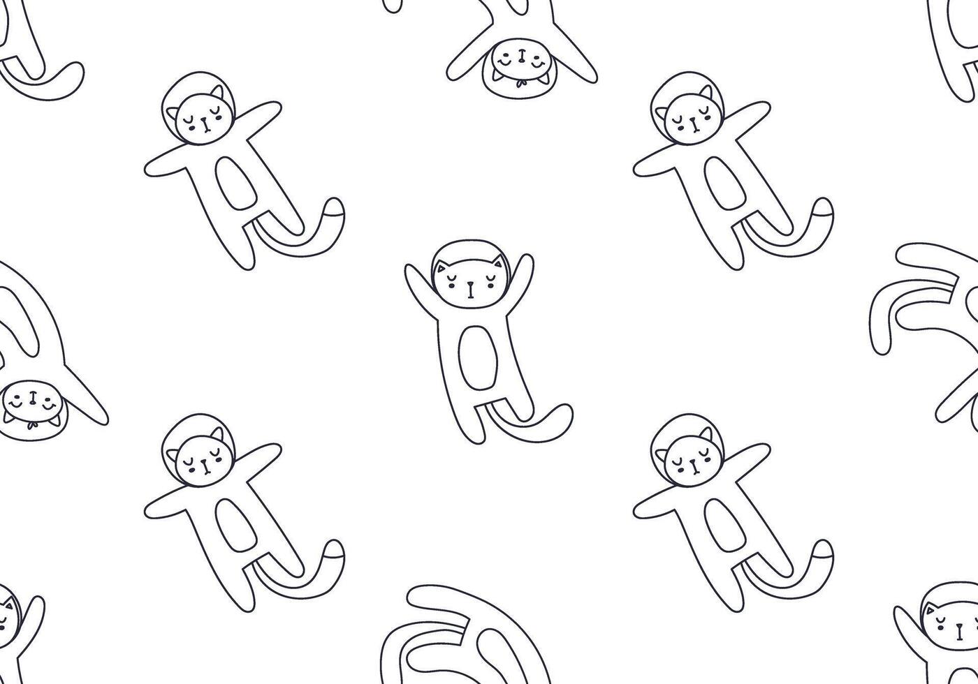 Seamless pattern with a doodle galaxy cat. Simple cute cats in spacesuits floating in space. Hand-drawn illustration Pro Vector