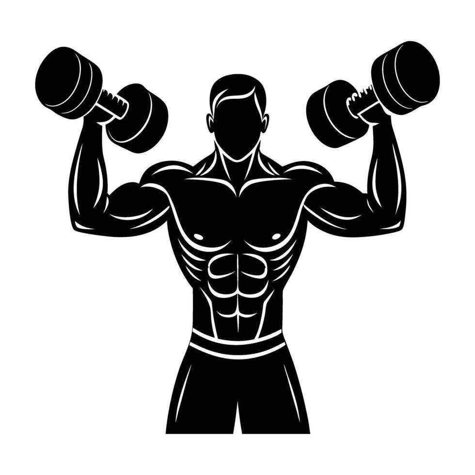 Strong man executing a hammer curl exercise with focus in clear silhouette vector