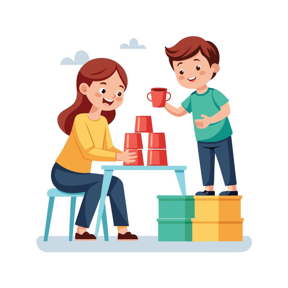 Siblings Enjoying a Fun and Fast Cup Stacking Challenge with Laughter and Smiles Pro Vector
