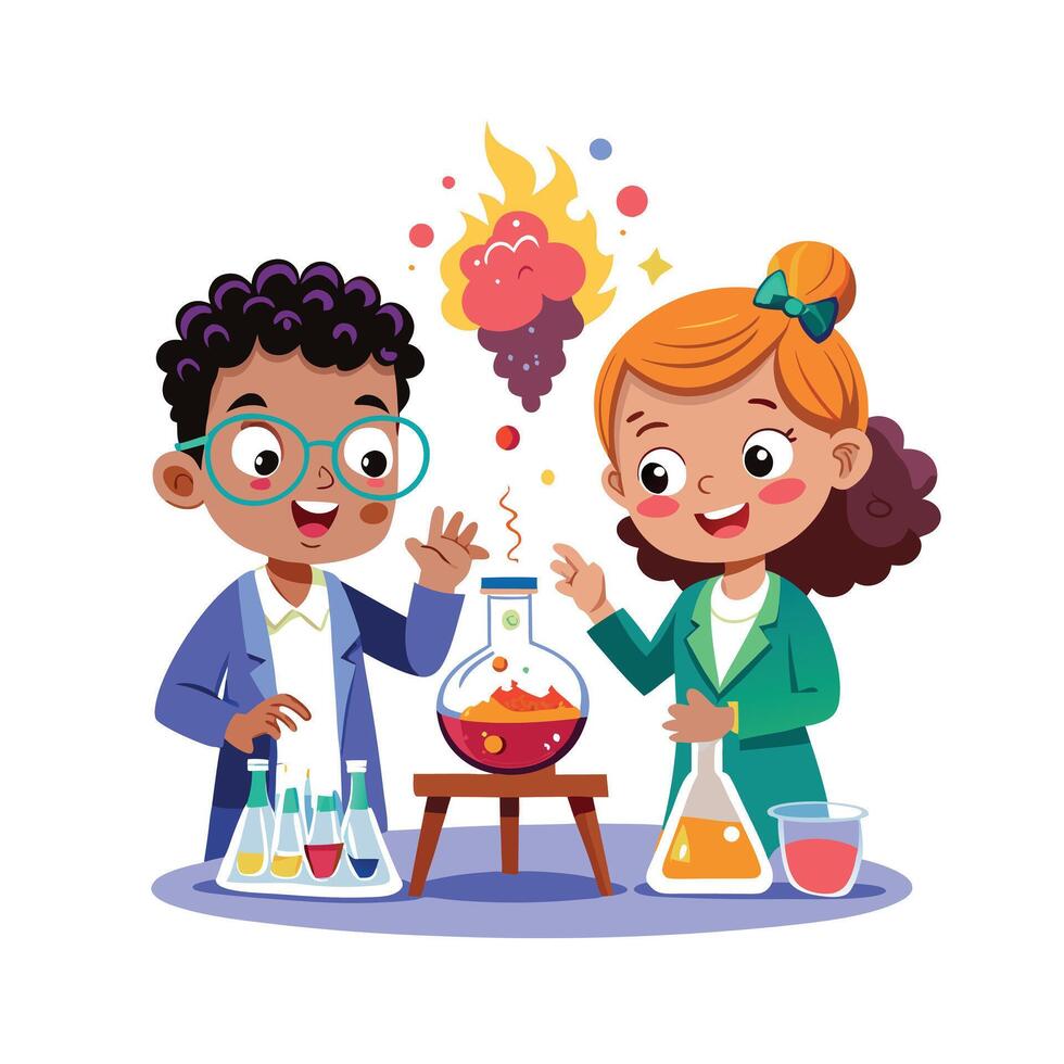 Siblings Hosting a DIY Science Fair with Fun and Experimental Projects Pro Vector